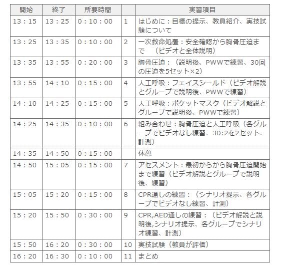 実習の流れは時間割(表参照)の通り、始めに目標の提示を行い、実習の最後に実技試験を行うことを説明しています。次に、周囲の安全確認から胸骨圧迫を開始するまでの手順をビデオ教材で学習した後、胸骨圧迫と人工呼吸の練習を行っています。胸骨圧迫と人工呼吸は、Practice while Watching(PWW)の手法を用いて行っています。PWWは、ビデオ教材の中のデモンストレーターが行う手技を見ながら、学生が同じ動作を行うことによって手技を修得する方法です。PWWにより、学生は正確な手技を身につけることができます。また、AEDの取扱いは、AEDの使用のビデオ解説を見て、AEDを使用するだけの練習を行います。ここでは、AEDの使用方法のみならず、使用上の注意点も学びます、さらに、学内・院内のAED設置場所についての確認も行い、実際にAEDを使用しなければならない場面に遭遇しても慌てることなく適切に対処できるように指導しています。最後に、安全確認からCPR、AEDを使用、申し送りを行うまでの一連の流れの練習を行います。